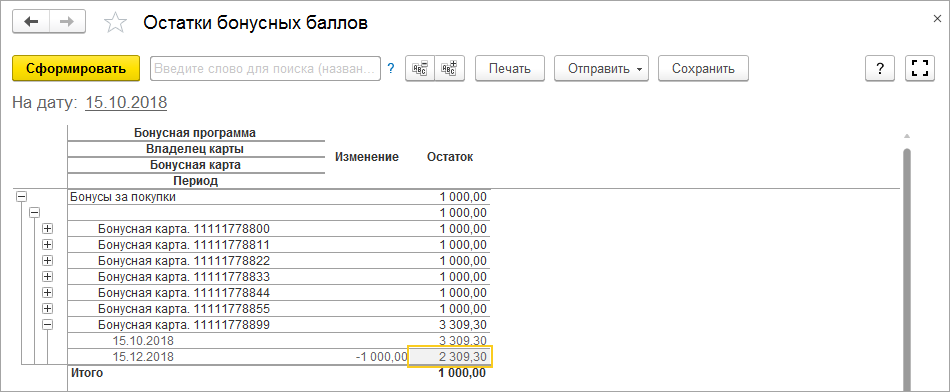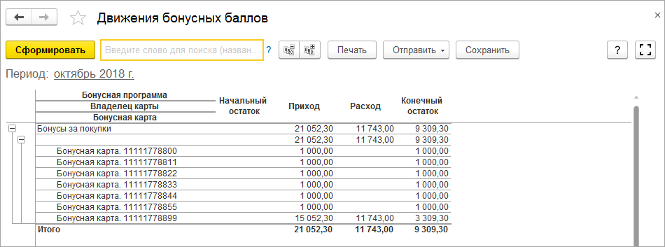 Для начисления баллов сразу всем клиентам и для корректировки ошибочных операций предусмотрен ввод произвольных операций начисления и списания баллов, используется документ Начисление и списание бонусных баллов.