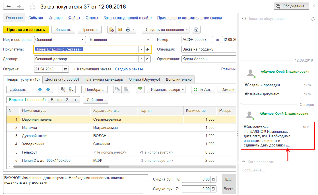Об изменении состояния ассистент 1С:УНФ напишет в контекстном обсуждении документа и, при необходимости, оповестит сотрудника, указанного в поле (кого оповестить).
