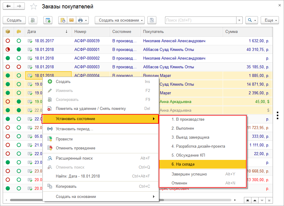 Чтобы перевести заказы в новое состояние необходимо открыть список заказов и выбрать документ или сразу несколько (зажав клавишу Shift или Ctrl).