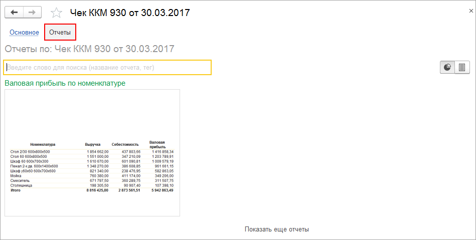 Появилась возможность быстро узнать прибыль по чеку ККМ или отчету о розничных продажах – в соответствующие документы добавлена ссылка для перехода в список контекстных отчетов.