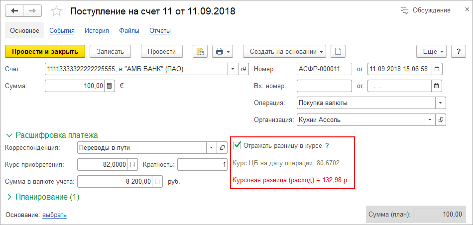 В документах покупки валюты появилась возможность формировать движения по курсовой разнице в процессе оформления документа с помощью флажка Отражать разницу в курсе.