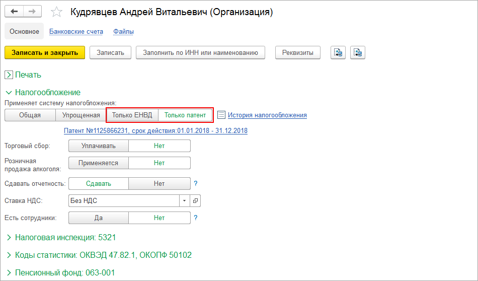 В карточку организации добавлен выбор системы налогообложения: Только патент и Только ЕНВД.