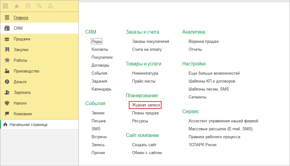 Все записи наглядно отражаются в рабочем месте Журнал записи, доступном в разделе CRM.