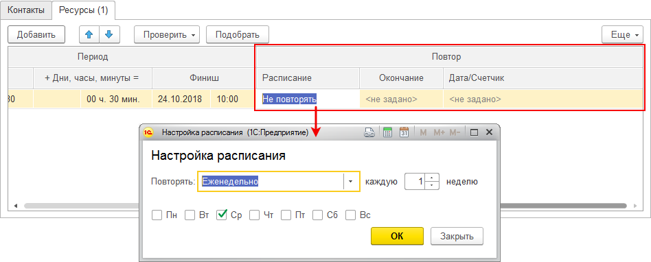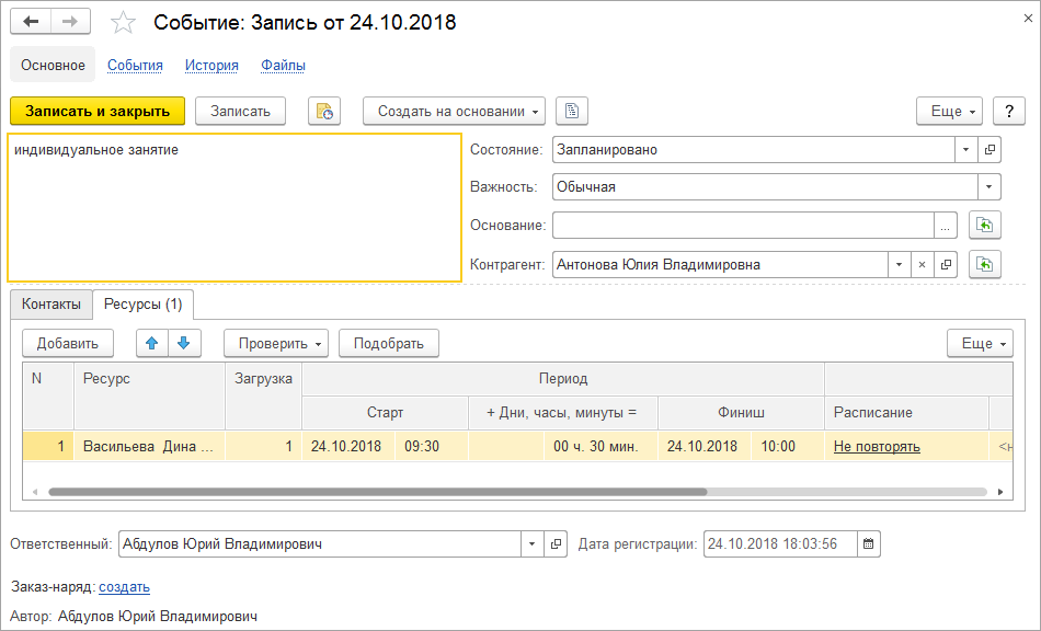 В событии данного типа присутствует вкладка Ресурсы. При создании документа из журнала записи она автоматически заполнится информацией о задействованном ресурсе, дате/времени старта и финиша.