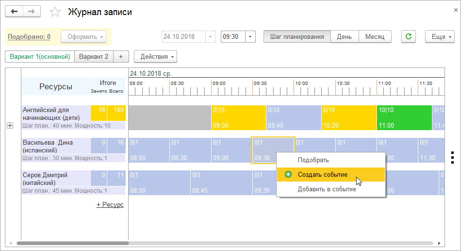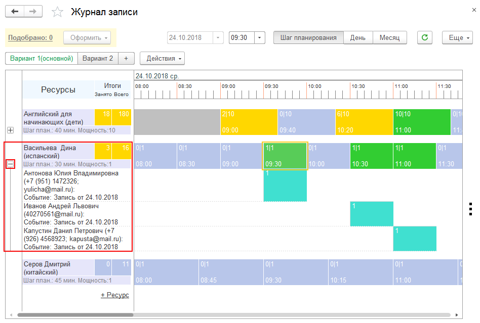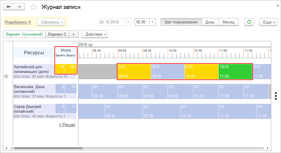 Занятые интервалы в журнале записи будут выделены цветом. Есть ли свободное время в этот день можно увидеть в колонке Итоги, напротив соответствующего ресурса.