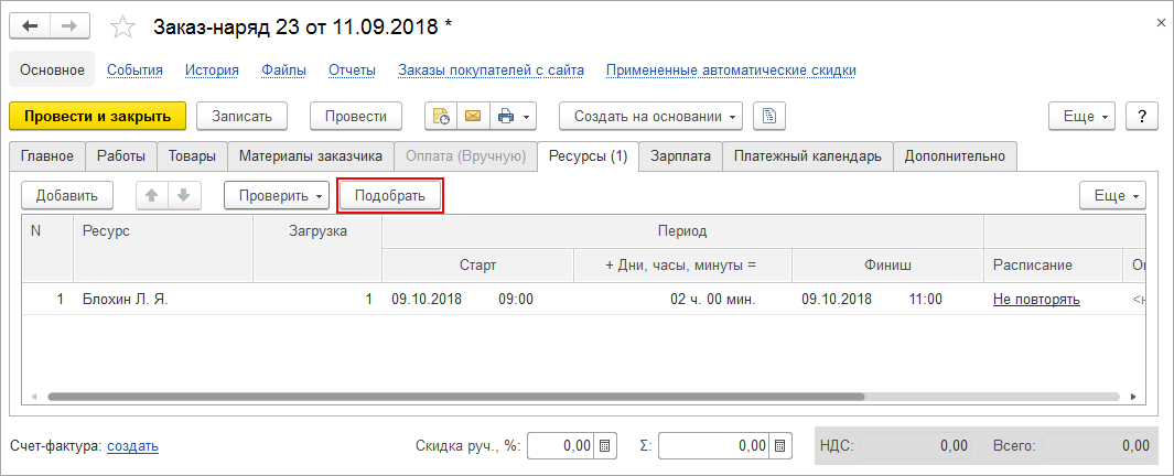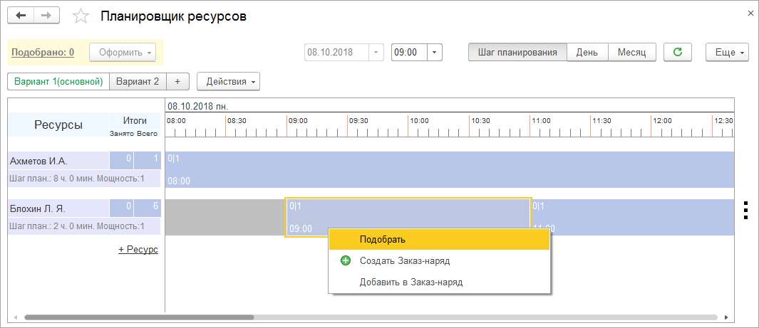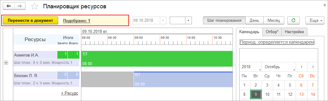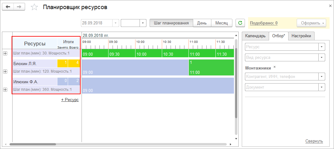 Быстро подобрать ресурс в документах также можно с помощью планировщика, на вкладку Ресурсы добавлена команда Подобрать, открывающая планировщик.
