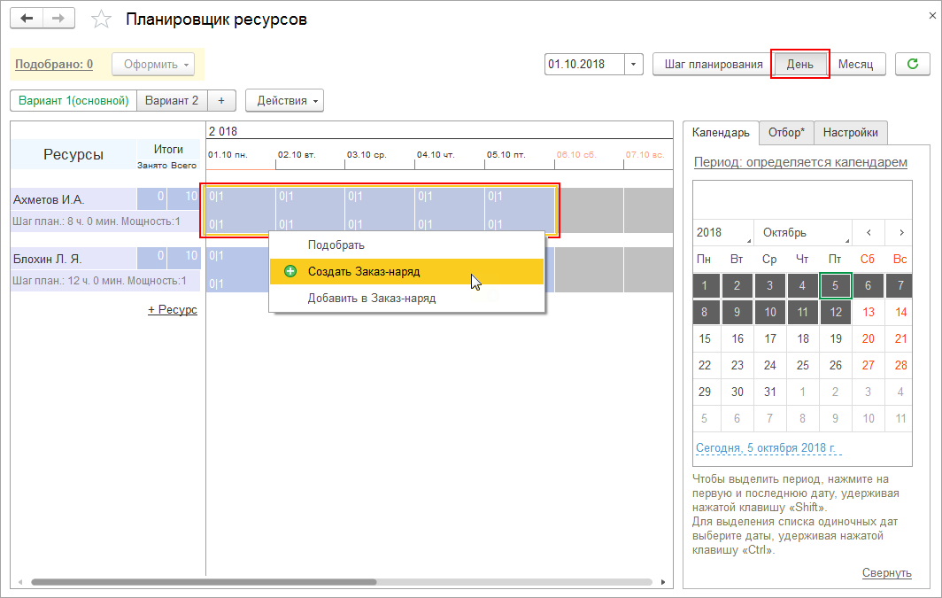 Далее нужно выделить планируемые дни, кликнуть правой кнопкой мыши на выделенный отрезок времени и в выпадающем меню выбрать команду Создать Заказ-наряд.