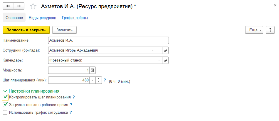 В группе Настройки планирования можно уточнить, контролировать ли шаг планирования при заполнении периода загрузки, проверять ли загрузку ресурса в нерабочее время, и учитывать ли отклонения графика сотрудника от графика работы ресурса.