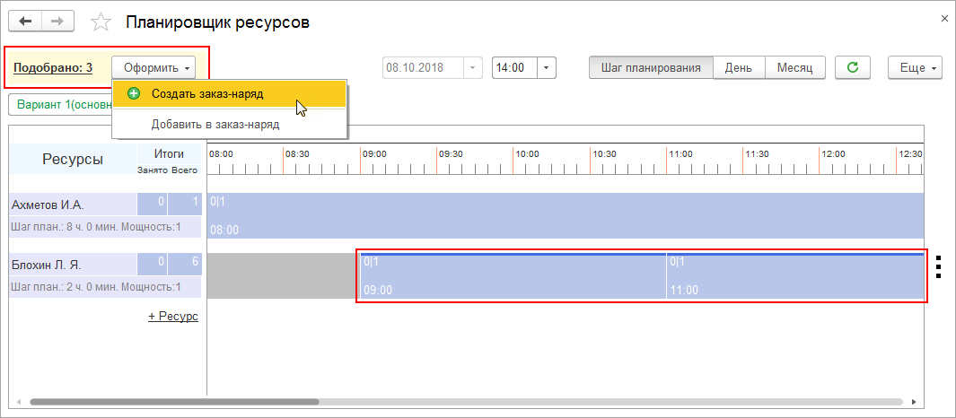 Запланировать загрузку ресурса можно двойным кликом мыши по свободному отрезку времени в форме планировщика ресурсов. По клику программа предложит выбрать действие: