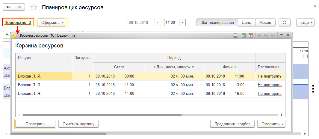 В корзине ресурсов можно выполнить проверку подобранных интервалов (нет ли конфликтов при загрузке), оформить документ планирования и, если необходимо, очистить содержимое корзины.