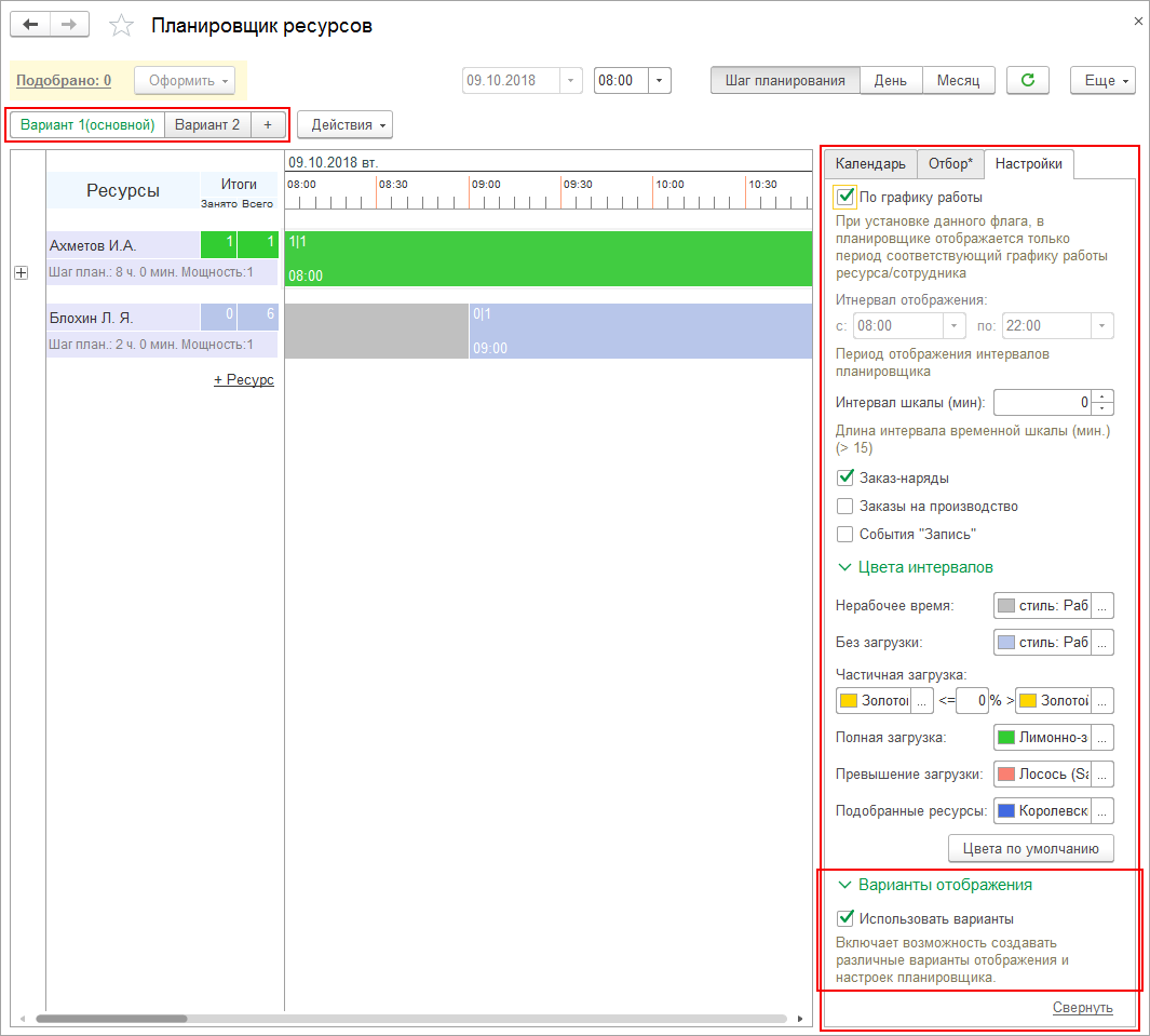 Изменился внешний вид планировщика – в нем появилась удобная навигация по периодам, различные отборы по ресурсам, видам ресурсов, контрагентам и документам, цветовая индикация загрузки ресурсов.