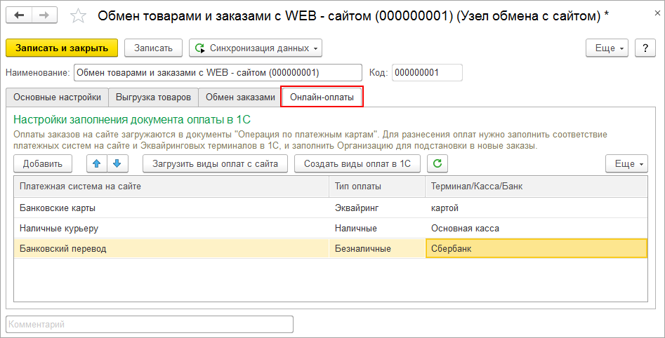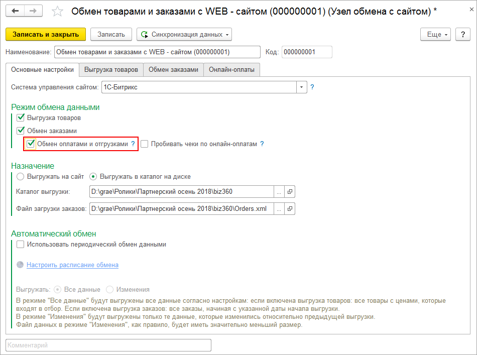Для использования двустороннего обмена в настройках обмена с сайтом должен быть установлен флажок Обмен оплатами и отгрузками.
