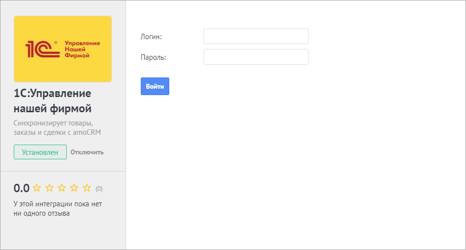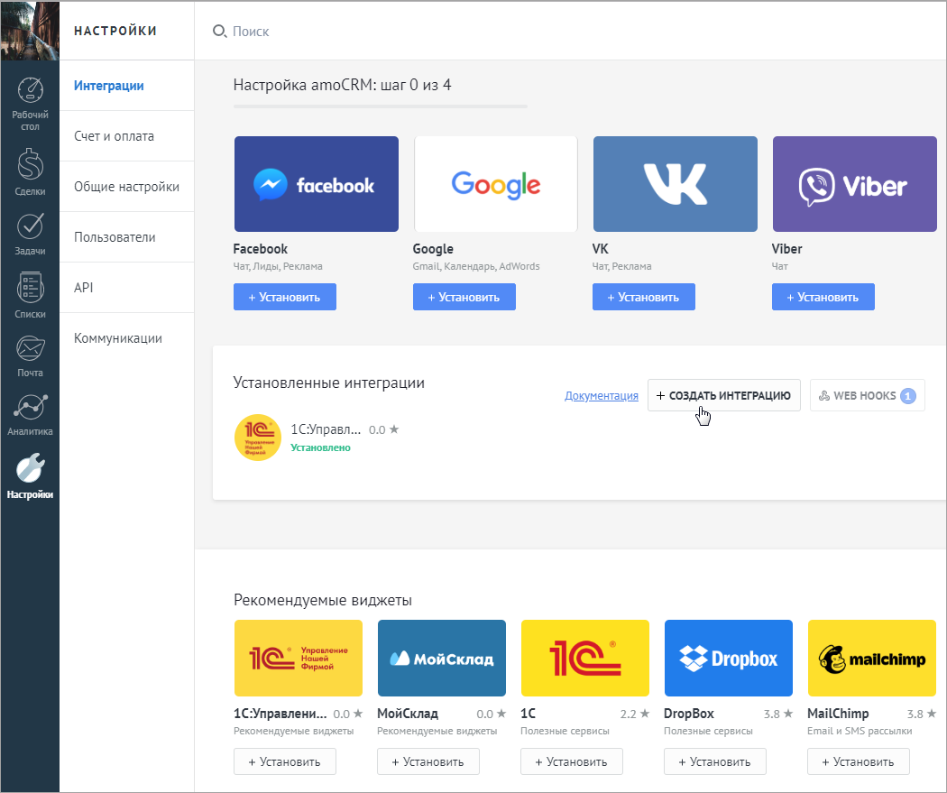 Для подключения интеграции необходимо в amoCRM перейти в список виджетов и найти виджет 1С:Управление нашей фирмой (аккаунт amoCRM – Настройки – Интеграции).