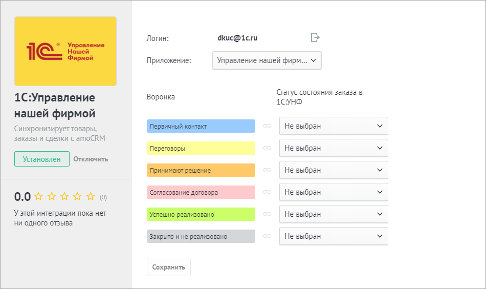 Установите соответствия статусов сделок amoCRM и состояний заказов 1С:УНФ. Первое соответствие статусов является начальным для синхронизации и не может остаться незаполненным.