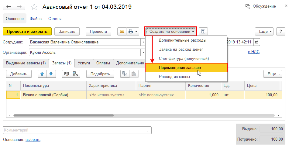 Для этого реализован ввод документа Перемещение запасов на основании документа Авансовый отчет.