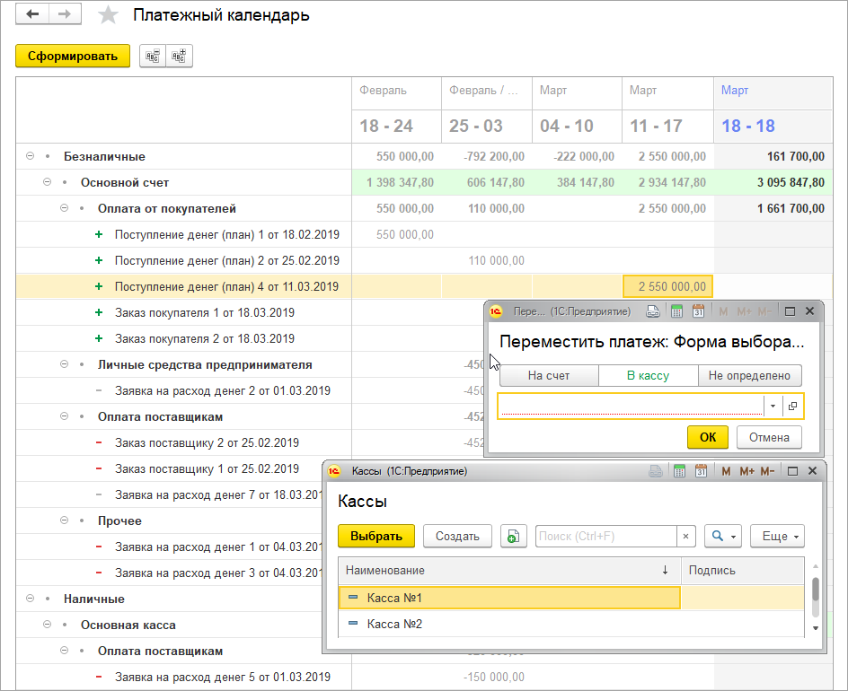 Если увидели, что не хватает денежных средств на расчетном счете, но есть поступление в кассу, просто запланируйте перенос денег из кассы на расчетный счет, не выходя из отчета.
