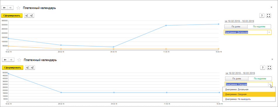 Для визуального анализа состояния счетов и касс в платежном календаре появились интерактивные графики.