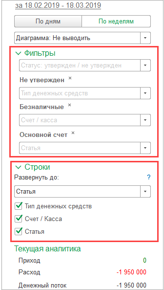 Выберите аналитики для формирования отчета: организации, счета, кассы, документы и уровень раскрытия группировок при каждом открытии.