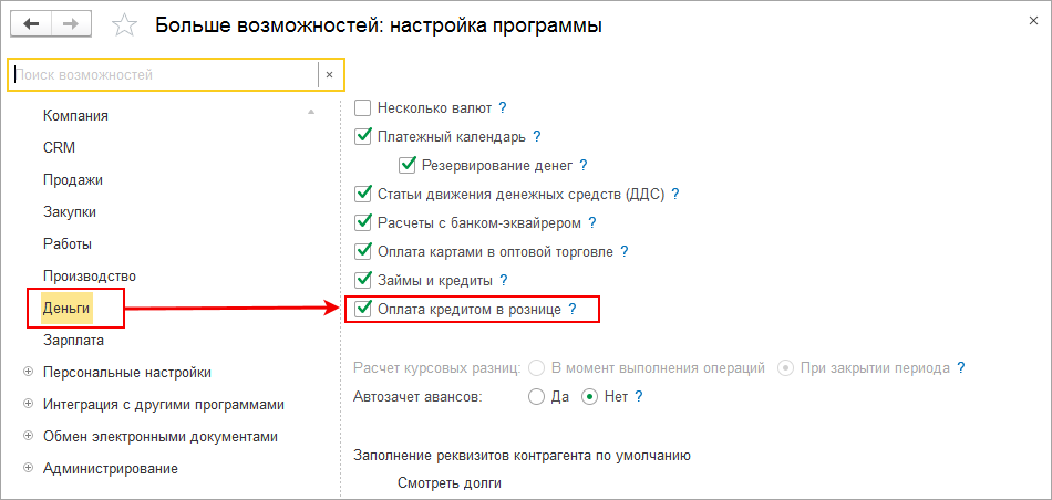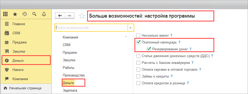 Возможность резервировать денежные средства и видеть свободные остатки появляется после включения опции Резервирование денег.