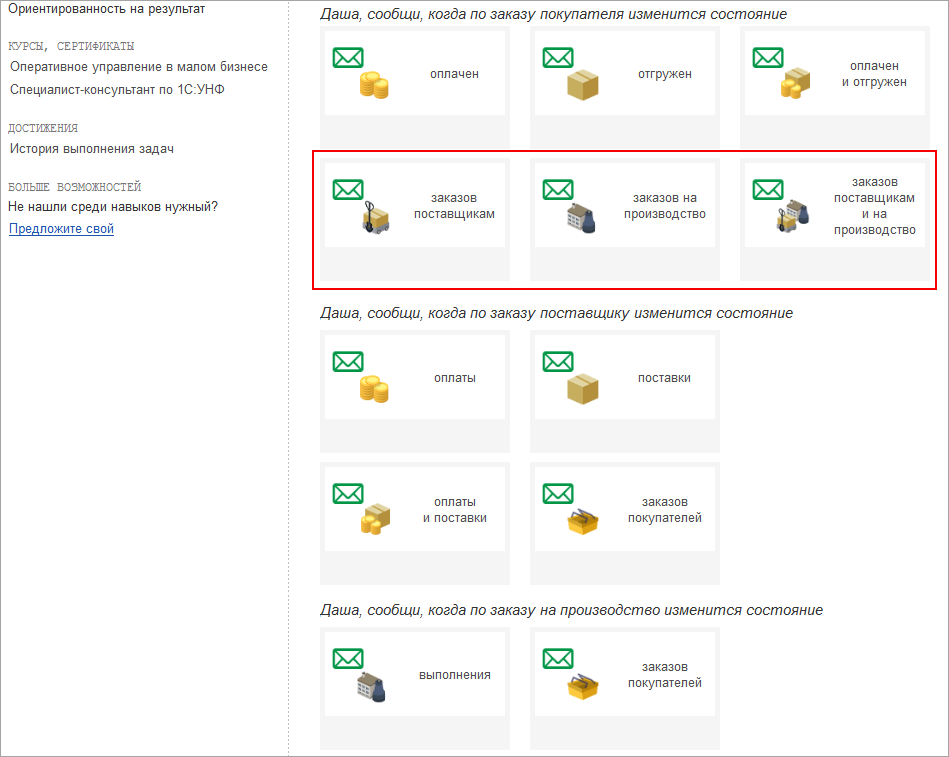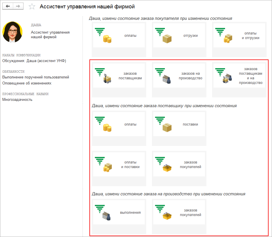 Все навыки ассистента можно настроить в разделе CRM – Сервис – Ассистент управления нашей фирмой.