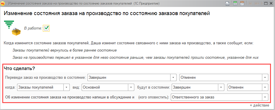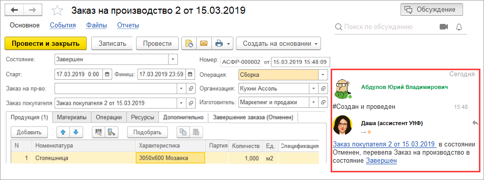 Ответственный менеджер отменяет Заказ покупателя, а Даша сразу отменяет Заказ на производство и сообщает нам об этом.