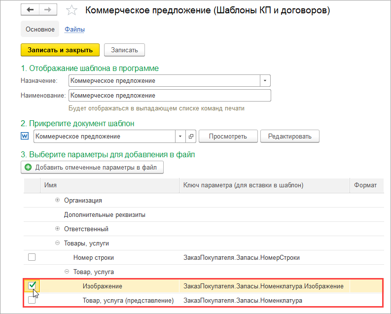Теперь добавляйте изображение номенклатуры как параметр в шаблон договора. Настраивайте размеры изображения.