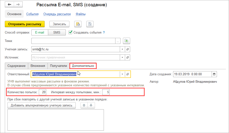 Вводите ограничения, указывая максимальное количество попыток на вкладке Дополнительно документа Массовая рассылка.