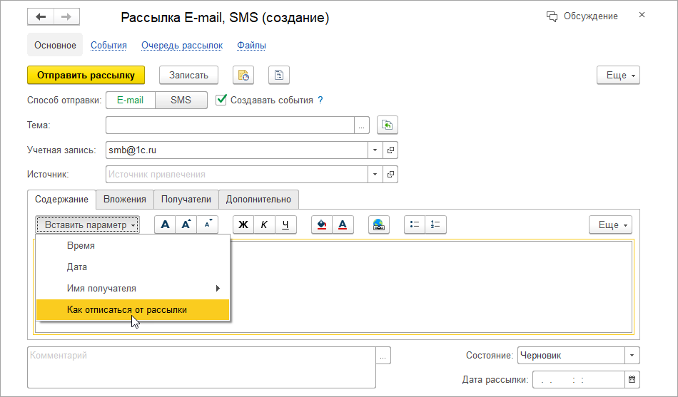 При создании шаблона массовой рассылки указывайте получателей и канал доставки рассылки. Нажимайте Отправить рассылку и продолжайте работу.