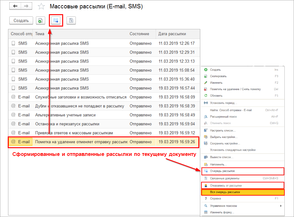 Наблюдайте за ходом рассылки в очереди рассылок. Просматривайте список отказавшихся от рассылки.