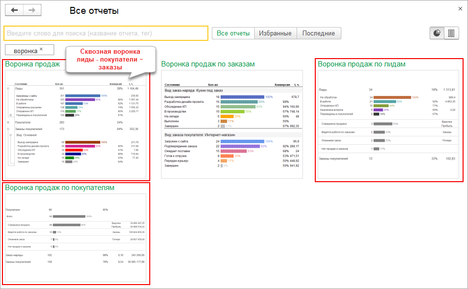 Новые варианты воронки можно найти по тегу "воронка" в списке отчетов раздела CRM.