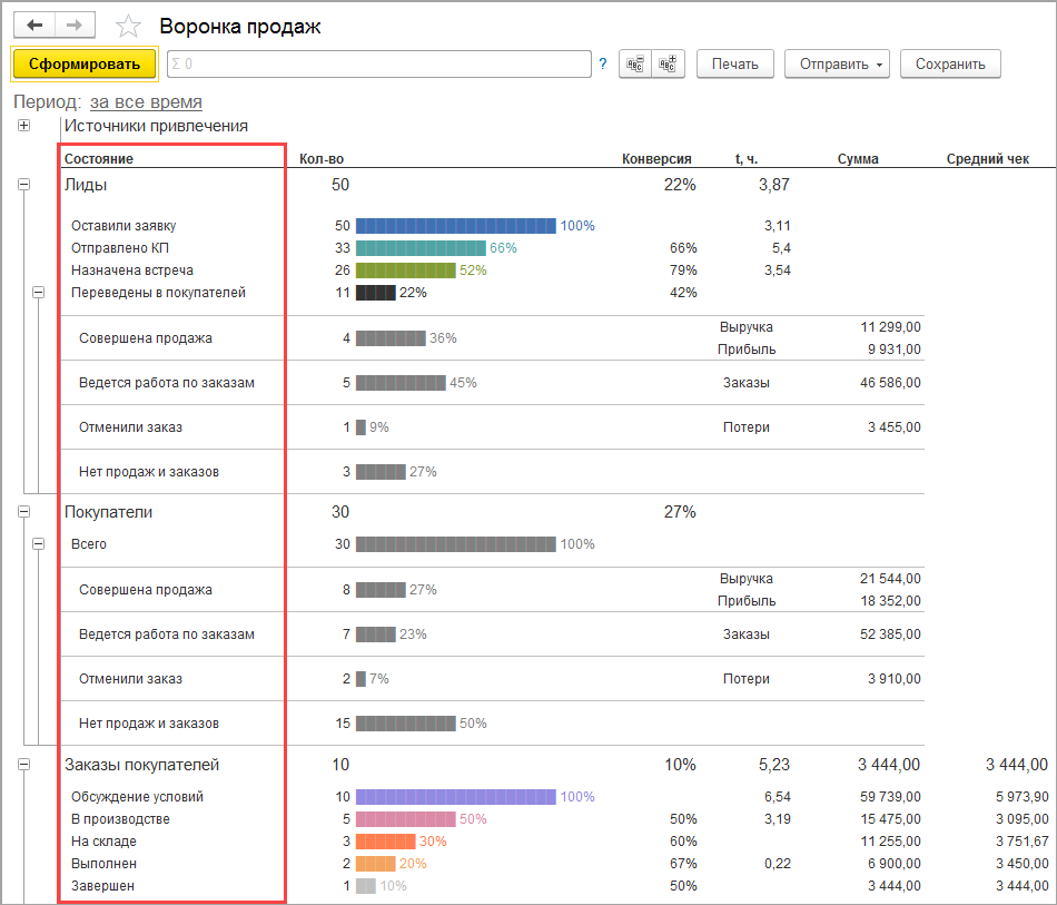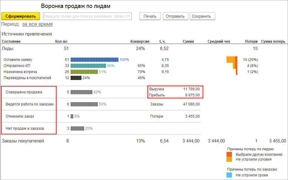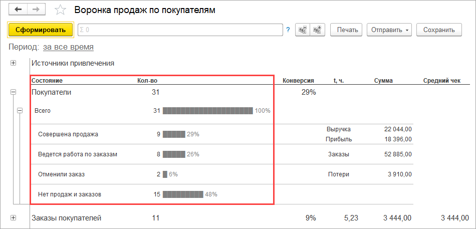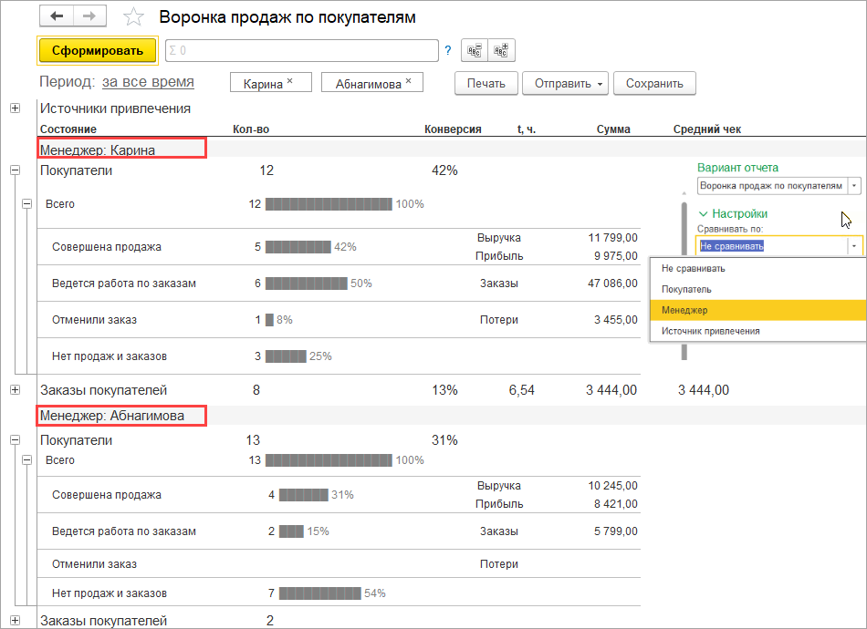 В варианте отчета Воронка продаж по покупателям анализируйте весь цикл работы с покупателем.