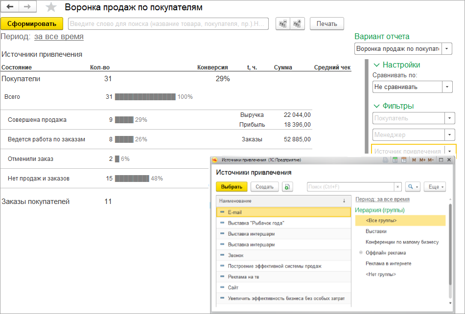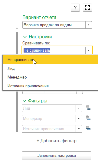 Формируйте отчет Воронка продаж с отбором по всем реквизитам лидов, покупателей и заказов. Сравнивайте воронки по отобранным лидам.