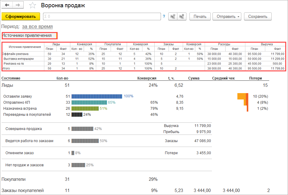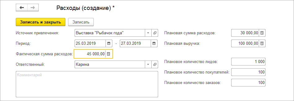 Для источника привлечения можно указать плановые и фактические расходы, плановое количество лидов, покупателей, заказов. А также плановую выручку за период.