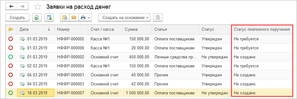 Также вы можете сделать отбор по колонке Платежное поручение, выбрав один из трех статусов: Создано, Не создано, Не требуется.