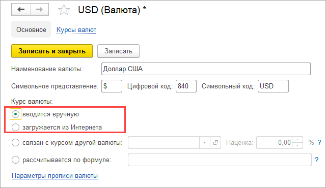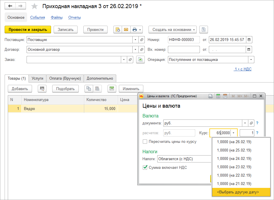 При изменении курса актуализируйте его, выбрав из списка. Курс документа расчетов появляется первым в списке.