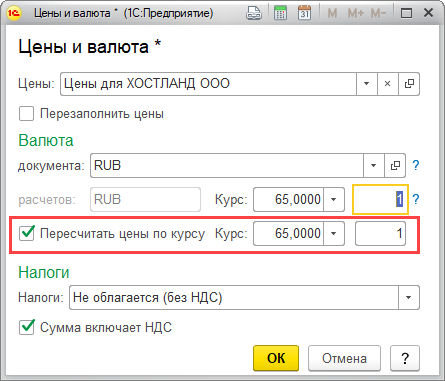 Нажимайте на гиперссылку с курсом валюты и выбирайте валюту «Рубль». Автоматически устанавливается флаг Пересчитать цены по курсу.
