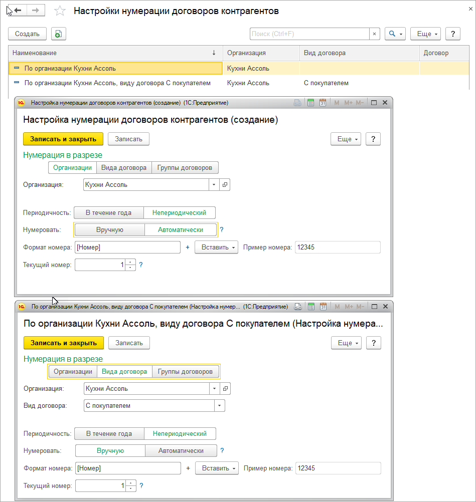С помощью гибких настроек автонумерации можно реализовать и другие сценарии, например различный порядок нумерации для разных организаций, видов договора или групп договоров.
