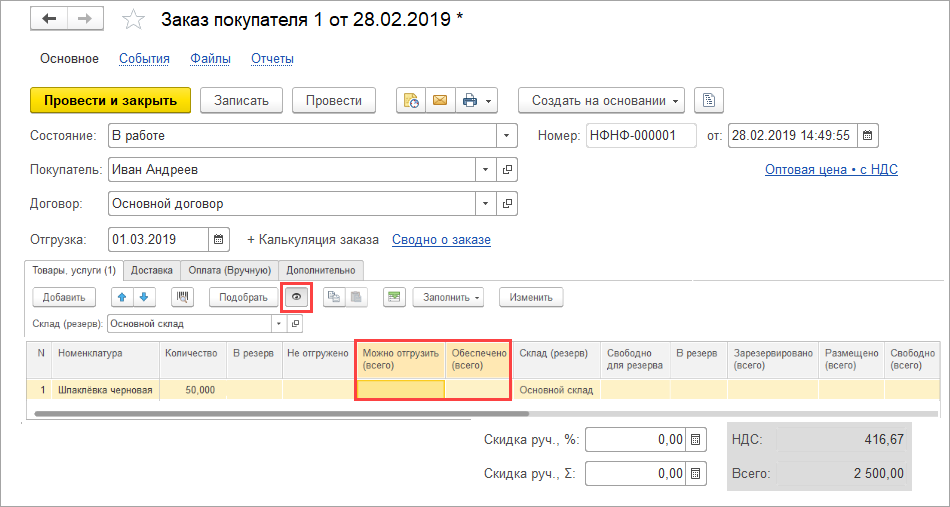 Новый режим включается по кнопке с изображением глаза и позволяет сразу увидеть количество товара, которое можно отгрузить, доступное на складах, зарезервированное под заказ, ожидаемое к поступлению.