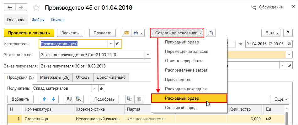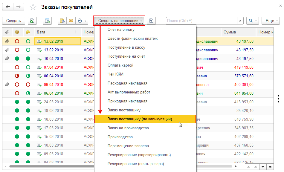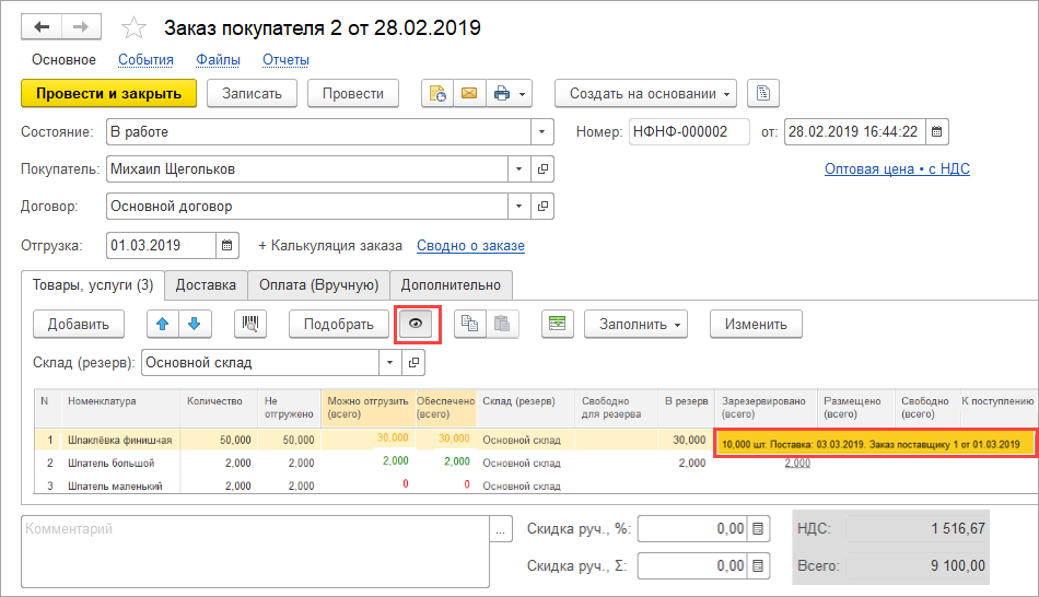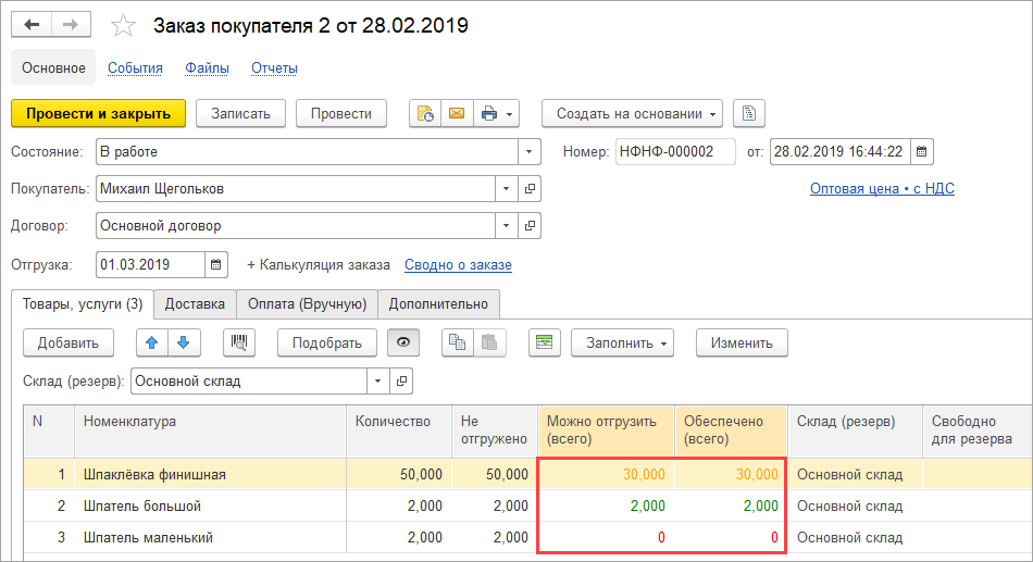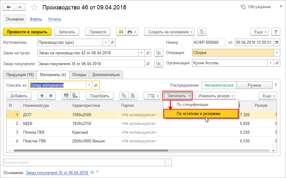 Выбирайте заказ покупателя, под который будет зарезервирован запас. Выбор доступен только из заказов документа-основания.