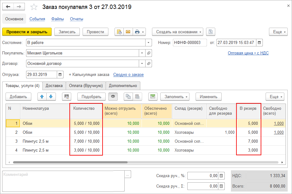 количество зарезервированного товара и единица измерения; склад резерва; документ резерва.