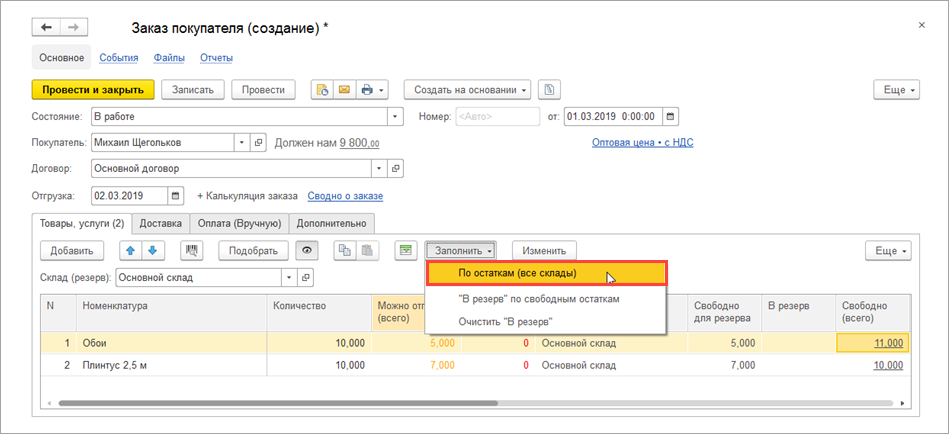 Теперь вы можете распределять каждую строку или все строки с помощью команды Заполнить – по остаткам (все склады).
