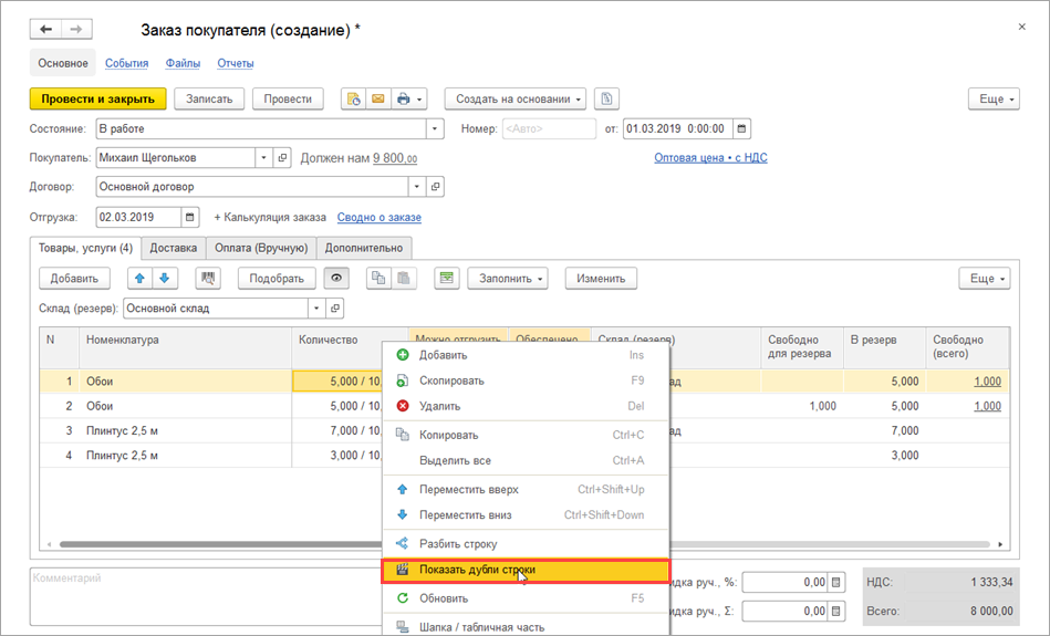При нажатии на значение в колонке Зарезервировано (всего) документа Заказ покупателя появляется контекстное меню с расшифровкой: