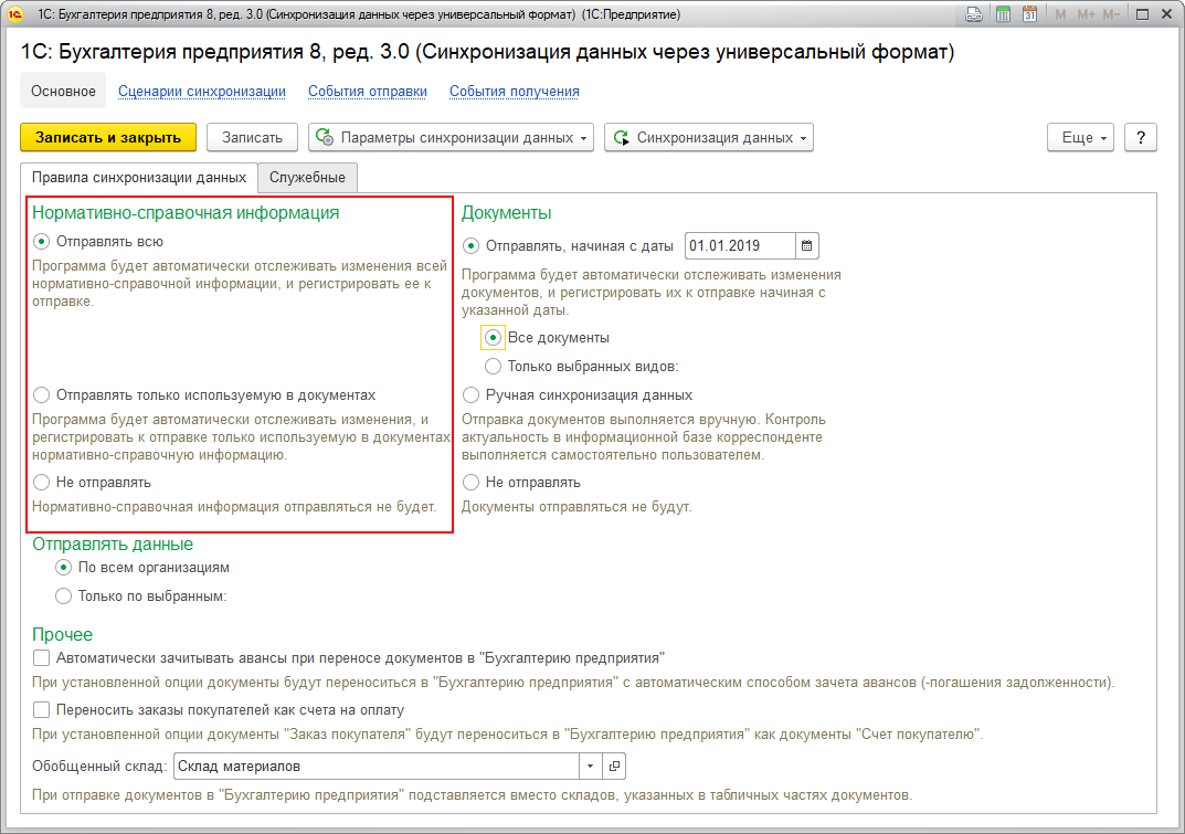 В обмен через универсальный формат теперь можно включать только те справочники НСИ, которые используются в документах – в настройки обмена добавлена возможность устанавливать правила выгрузки НСИ.