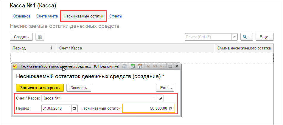 Настраивайте размер неснижаемого остатка в справочниках Банковские счета и Кассы.