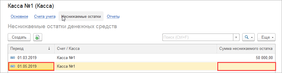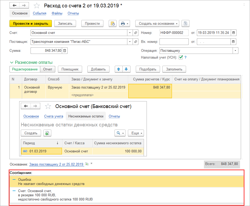 Если после проведения документа сумма на счете или в кассе окажется меньше неснижаемого остатка, то программа предупредит и запретит проведение документа.