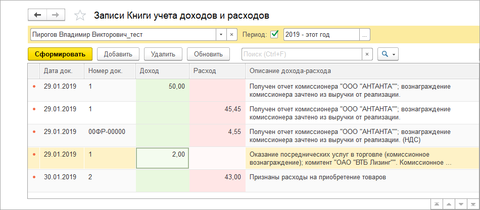 В этом случае в КУДиР появляются две записи: доход на сумму комиссионного вознаграждения и расход на сумму этого же вознаграждения.