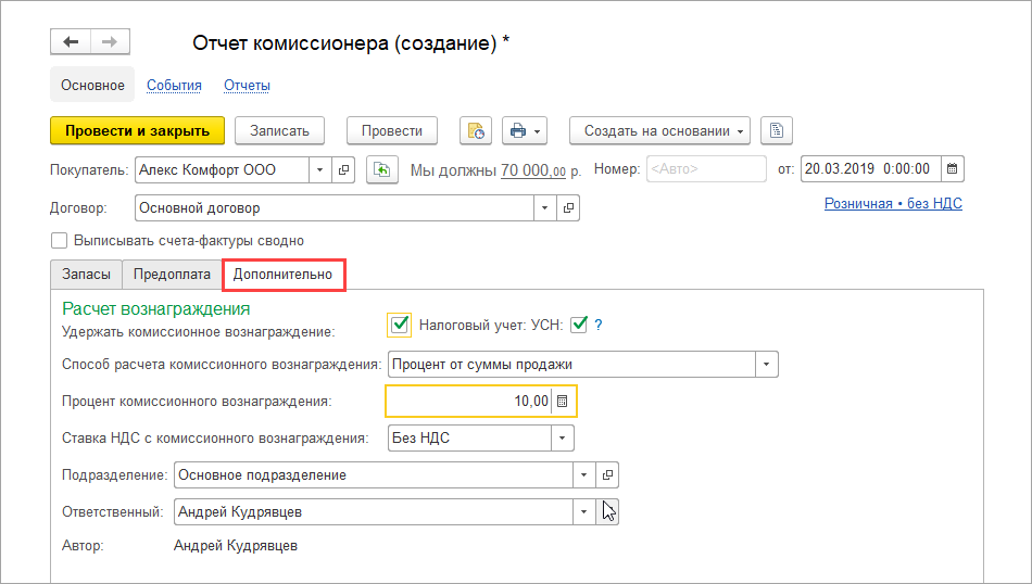 В Отчете комиссионера на закладке Дополнительно появился признак Налоговый учет УСН.