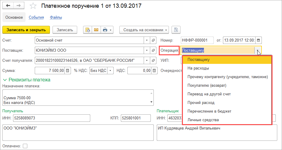 В платежное поручение добавлены новые операции: Покупателю (возврат), Перевод на другой счет, Личные средства, На расходы,