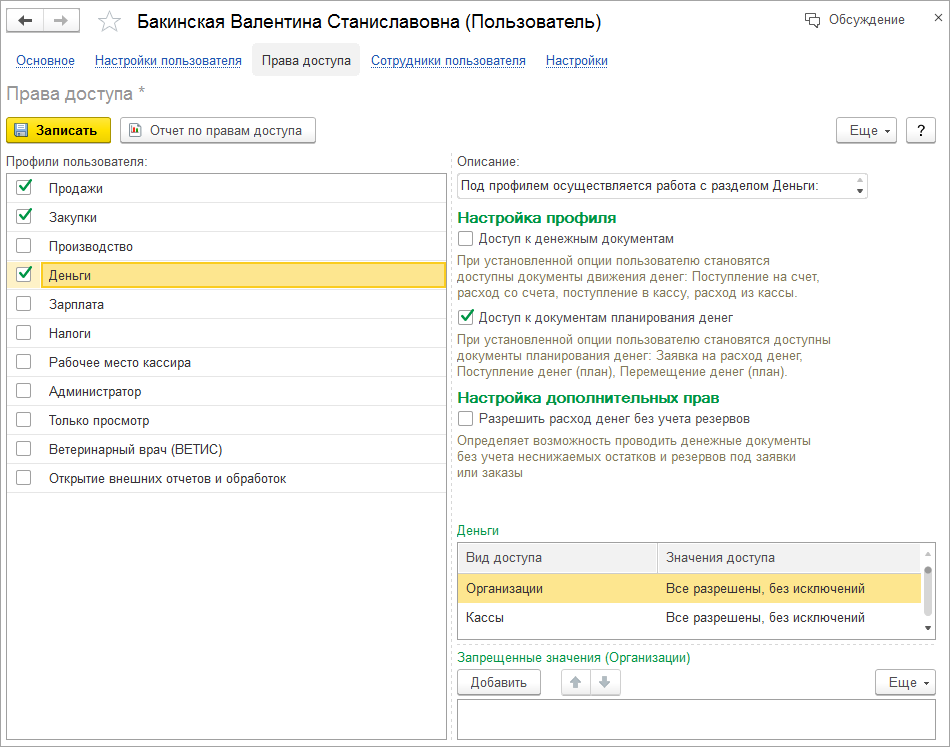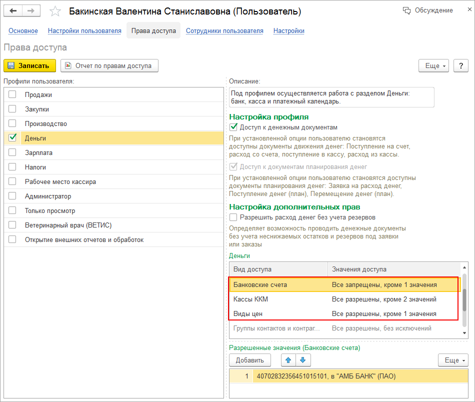 Доступ к денежным документам и документам планирования денег контролируется соответствующими опциями в профиле прав доступа.