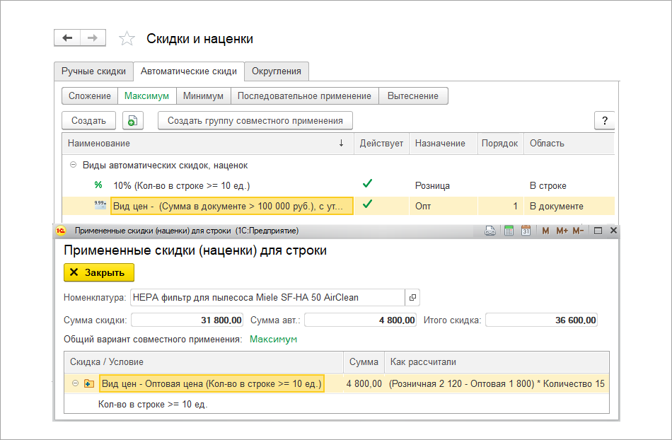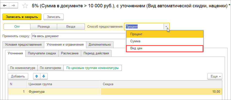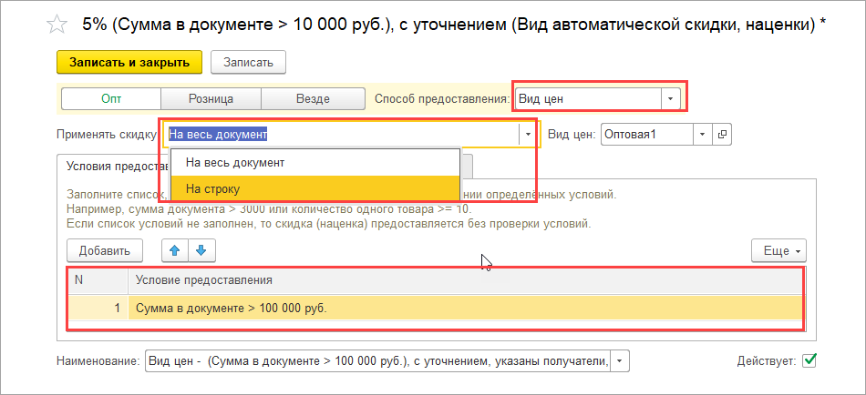 Например, если в строке больше 10 шт. товара, автоматически подставится оптовая цена.